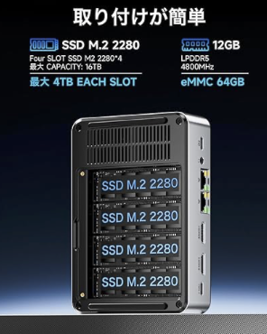 こいつの懸念点は放熱かな。実際にレビューを漁ってみるとSSD用に小さい2連FANがついているがそれでもかなり熱くなるらしい。それからサーバ用としてはファイルサーバとしてだけ考えると直付なLPDDR5 12GBでもじゅうぶん間に合うが、例えばFreeNAS OSをいれるだとかDockerでいろいろ構築するだとかすると足らなくなりそうで、今後Memoryを増設できないってのはNAS用としてだすなら「?」な部分。それにもしほんとに使うなら底面カバー外して14cmぐらいのUSBファンの上に乗せて冷やすとかが必要そうで見た目もスマートではなくなるし。ま、私はNASとしてはAsustorがあるので、更にこれを組もうとかは今のところは思えないので食指は動かんが、なかなかおもしろいマシンではある。