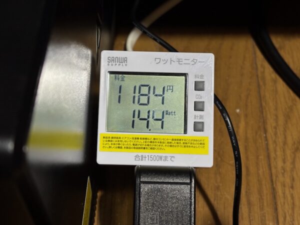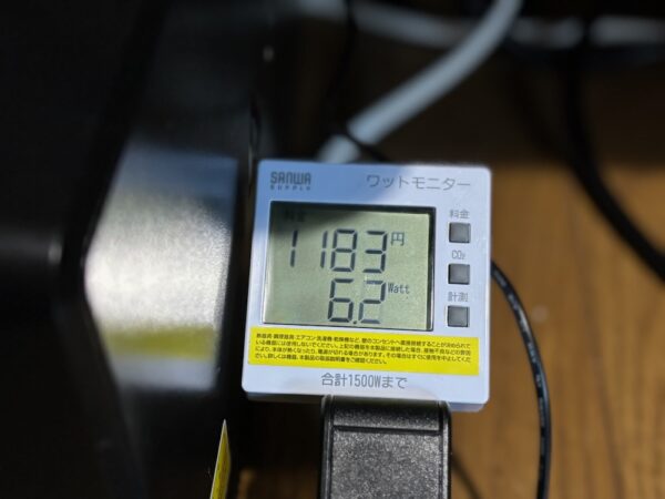 まだ設定したばかりで使っていかんとなんともだが、とりあえずSSD2枚、Memory2枚、2.5GbE LANのみ接続のubuntuでの待機時の電力をAC側で計測。電源On直後は10-15wぐらいにはなるけれど待機時で上の写真の通り6.2Wぐらい。sambaでフルに書き込んでいる状態で下の写真の通り13w-15wぐらいかな。