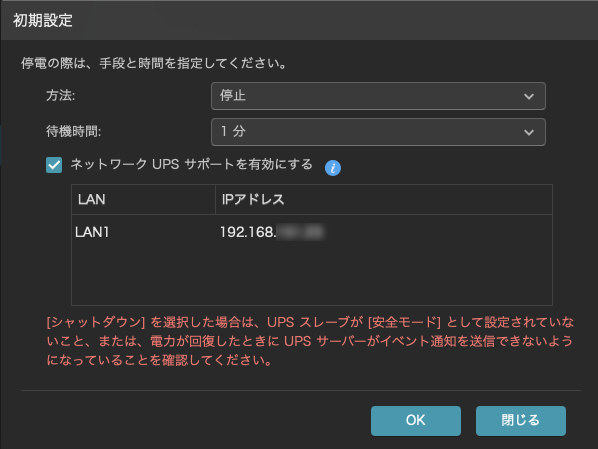 ASUSTORのNAS、AS3304T v2には当然のようにネットワークUPSの設定はあって、ネットワーク経由で他のNASやサーバを停電時などに安全にシャットダウンさせることができる。できるのだが、やり方とか設定方法とかの記述が一切ない。ヘルプにもマニュアルにも無くて、どうすればいいのだ?!という感じなのだが、ECOFLOW River3 PlusのUPS機能はさらにひどくて待てど暮せど実装されそうに無いので重い腰を上げて手探りでやってみたのの、メモ。