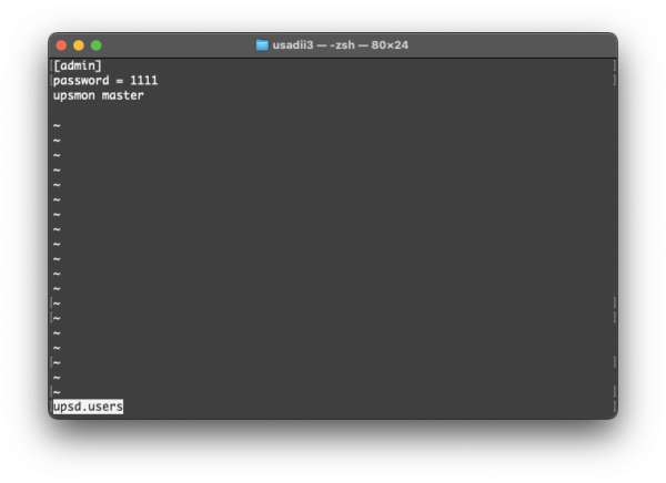 viで書き足したあと、「ネットワークUPSサポートを有効にする」をOFFにしてからONにし直してみたら・・・。はい。修正前に戻ってました。修正せずにマニュアル通りに「ユーザ名はadmin、パスワードは1111」(※マニュアルは間違っていて設定でのパスワードは「11111」だが)で使えってことね。わかった。とりあえず言う通りにする。(※ 「ネットワークUPSサポートを有効にする」を今後ON/OFFしないようにしてupsd.usersを編集するほうが安全かとは思います。が、ADMアップデートのときとかにまたデフォルトに戻る可能性はあるのでそこは注意)