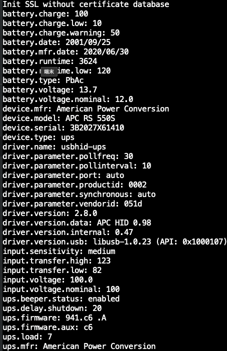 ↑こんな感じね。最後にupscコマンドでサーバーと通信テストしてUPSデータが見えるか確認。