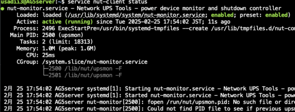 nut-clientのステータスを確認。activeが確認できれば動いているが、一応他のエラーメッセージがないかどうかも確認。エラーが出てればじっくり眺めて各所修正しエラーが出ないようにする。