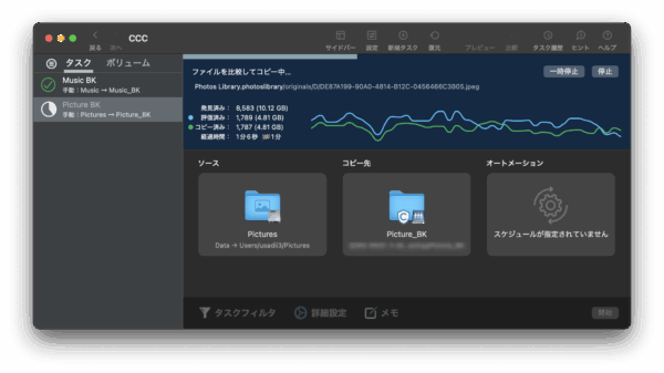 ていうかBunBackup並みの軽さと動作。加えてコピー時の動作とかもグラフ表示されてとても分かりやすいので個人的感想だがBunBackupの(Mac用)高性能版てイメージが近い。いや最強じゃねぇか(嬉)。