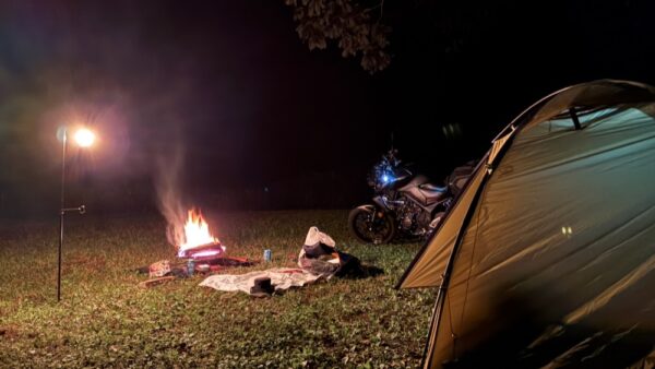 で、軽くて(総重量(約):2.15kg (ペグ、張綱、収納ケース含む))、比較的コンパクト(収納時 Φ16×43cm)でツーリングバッグにも余裕で積める。たとえばコールマンソロドーム(4kg)とかより、これに軽量タープ(私はninjaタープ 470g)とポール(私はninjaスティックSL 2本で300g)を組み合わせたほうが3kg弱と軽くなるし、レイアウトの自由度は上がるので、(ある程度経験がある人なら)こんな組み合わせもアリじゃないかと。