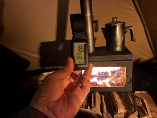 外の気温が2度ぐらいの日で、テント内は写真の通り18度です。ただし、お湯を沸かして湿度も60%以上にする必要があります。お湯を沸かしてないと15度ぐらいまでにしか上がりません。まぁサーカスTC コンフォートソロ、ソロ用だけど広いしね。Mt-sumiのマイクロでもこのぐらいには暖められる(あ、一酸化炭素チェッカーはもちろん使ってます(これ大事))。