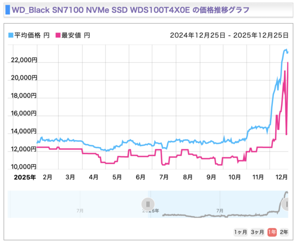 12,000円ぐらい、セールで1万を切ったりして買えてた1TB SSDは現時点で2万円越え。