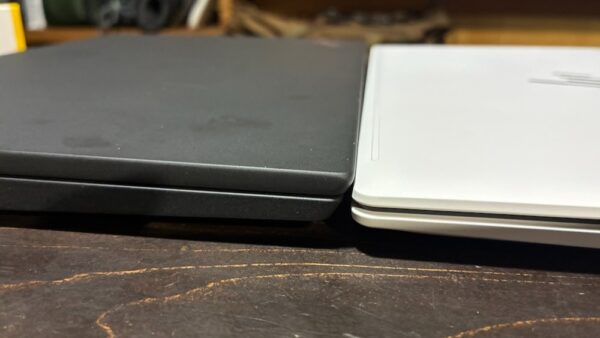 もちろんThinkPad X13 Gen3より軽い。わずかな差に思えるが実際にディスプレイ開いた高さを比べてみるとヒンジ構造の差もあって全然違う。