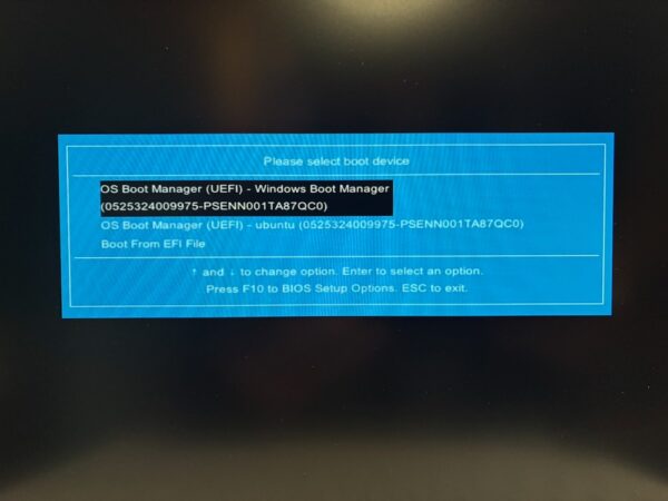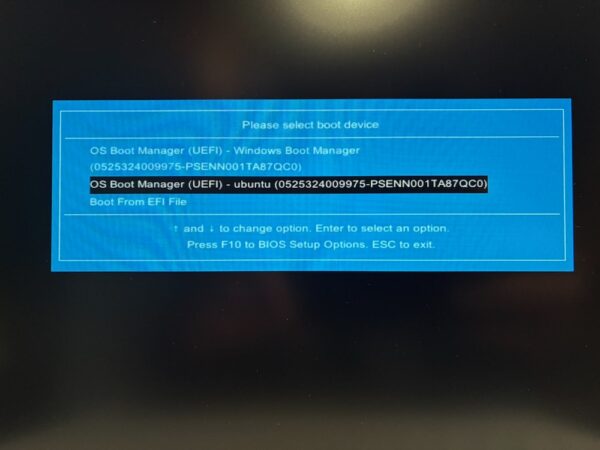 ここで少し考える。電源ON時にgrubが表示されて起動するOSを選ぶってのが通常の動作だけど、件のWindowsアップデート時などにgrubが壊わされるのをなるべく防ぐとかを含めた安定性確保や、アップデートの再起動などのためにはデフォルトでは基本的にWIndows11が起動するようになってたほうが都合がいい。UEFIでOSが選べるこの状態は物理的にストレージを2つにしてそれぞれのストレージにOS入れてブートローダーを2ヶ所つまりそれぞれのストレージに確保してた状態に近い(ストレージが一つなのでEFIパーテーションはひとつだけどUEFI的に)なってたりしている? だとするとWIndows11のアップデートとかでgrubが壊される危険性も少しはへる? それにubuntuを起動する手順として「F9」boot menuだして選ぶ手間は増えるけれど、起動時のみだし、このままでいいのでは?