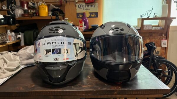 大きさ的にはほぼ同じ感じ。テーブルに置いたときのシールドの角度が違うのでかぶったときの正面の面積はKAMUI-5の方がコンパクトに見えるかも。サイドはインカムとか付けやすくてイイっすね。