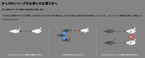 B+LINKは使えず、これまでの旧機種との接続はユニバーサル接続になるのか。こりゃ全て7X EVOに買い替える必要とかありそねぇ。。。もしくは新しいB+Flex通信に対応したB+COM One Ver2とかを待つとか、素直にCardo EDGEとかにするとか。なかなか素直に喜べないっすなぁ。うーん。。。