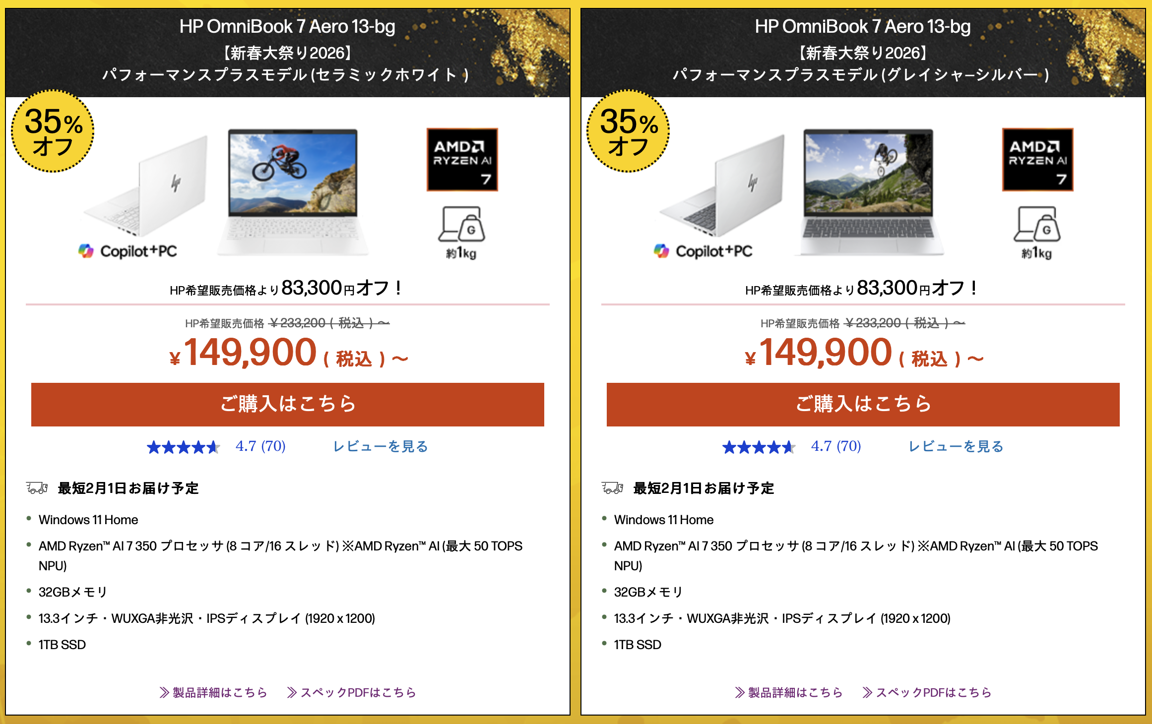 HPが1/13まで初売りやってます。(つまり少なくともそれまでは値上げ前の価格)